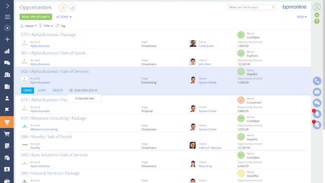 Account opportunity dashboard in bpm’online showing overview of an individual account’s status